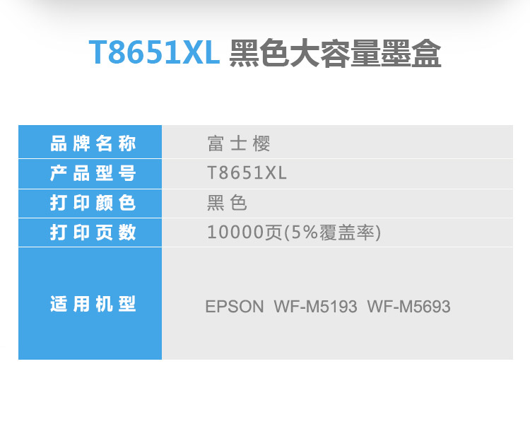 富士樱 T8651墨盒 T8651XL黑色大容量 适用爱普生EPSON WF-M5193 WF-M5693 喷墨仓式打印机(颜料墨水)